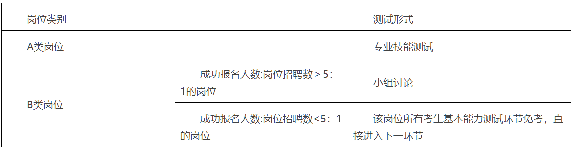 (4)基本能力测试主要采取专业技能测试、小组讨论等形式,对考生进行考察。各岗位具体考核形式见下表。