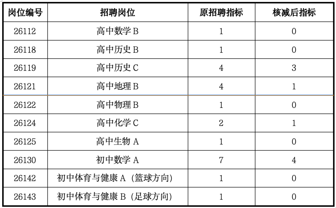 根据《慈溪市公开招聘2026年教师(第一批)公告》有关规定和报考人员资格初审情况,因符合条件的报名人数不足招聘指标3倍,以下岗位招聘指标调整如下: